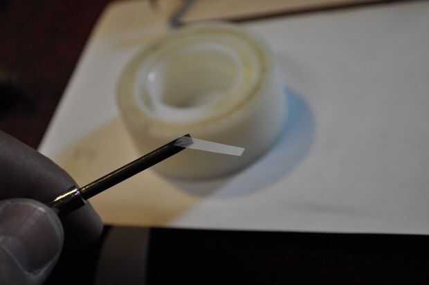 extraer suficiente cinta de cada bobina para que pueda trabajar. 6" suele ser suficiente para trabajar y no tiene golpe alrededor de la respiración. sí, la cinta de cassette es la luz. es muy importante que usted mantenga la orientación correcta de la cinta aquí. aplicará el empalme a la parte trasera de la cinta y que necesita para asegurarse de que inadvertidamente no voltear la cinta. forma más sencilla que he encontrado hacer esto es utilizar un poste para mantener la cinta en su lugar mientras trabaja. ver foto 2.