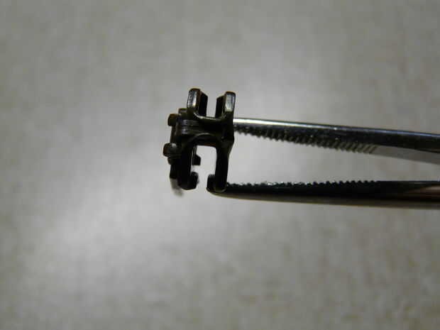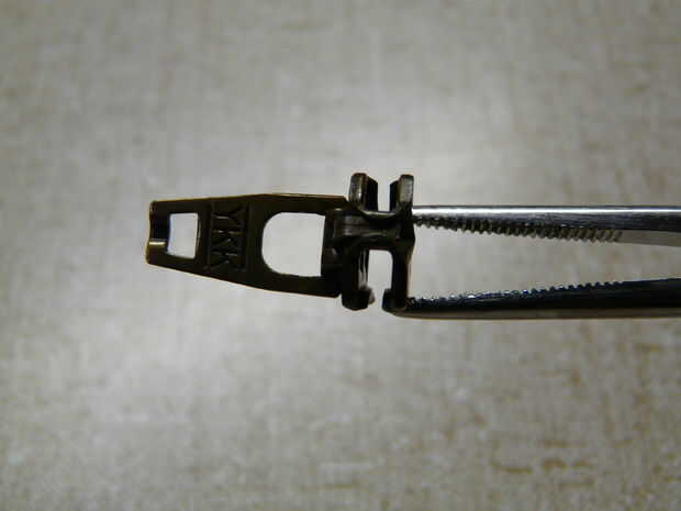 Hay una cerradura pequeña, activado por resorte en el resbalador de la cremallera misma que se supone que para mantener el cursor en el lugar. Un pequeño gancho baja y se aloja entre los dientes de la cremallera, representación el cursor inmóvil. Cuando subes la pequeña lengüeta, el gancho se retrae, permitiéndole mover el cursor arriba y abajo. Puedes ver el gancho funciona correctamente en mis dos primeras fotos.