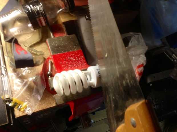 Primero fui para tubo de 32 W balastro electrónico, así que compré el CFL más similar que encontré (en la tienda de dólar), cual fue un 30 w el. Me llevé a mi taller y desmontada por cortarlo y haciendo palanca con un destornillador. Lo sentimos, las fotos son de 22 W uno, no tomar fotos de la reparación de 32 W, ya que no estaba muy seguro de que funcionaría. Por cierto, he encontrado 22 W CFL en la tienda de dólar.