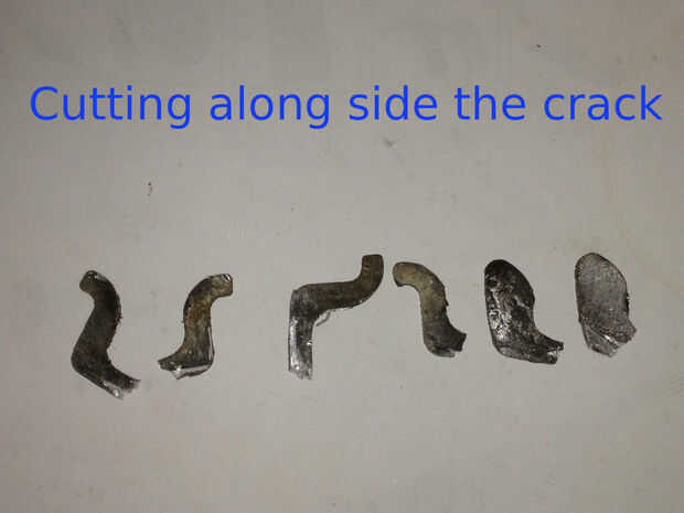 Ahora tenemos que encontrar el final de la grieta que generalmente se detiene en el grano de 1" de la llanta borde y [URL] a él... Perfore un agujero aquí con una broca de 13mm [lentamente] pero no derecho a hacer lo mismo con la parte inferior. Ahora hacemos un valle superior y el inferior dejando [2mm de espesor] imagen 4-5, muestra que también depende del grosor del perfil. [2] muestra diferentes cuñas que corté de un montón de trabajo. La razón de esto es que mejor soldabilidad [soldadura de raíz]...