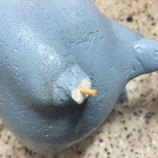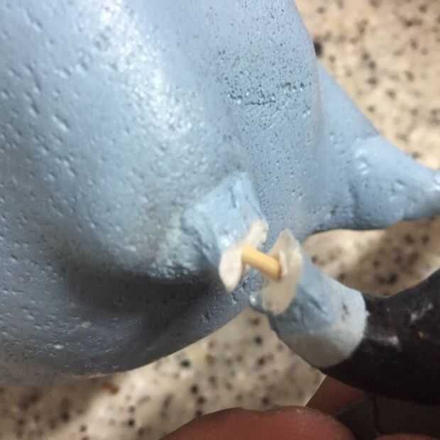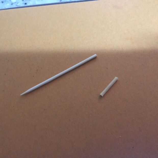En este paso, cortamos el palillo de dientes que vamos a utilizar para la estabilidad y alineación. Simplemente corte un poco más grande que lo que piensas que necesitas con un par de tijeras o el cuchillo del exacto el palillo de dientes. Una vez cortada, colocar el pasador (palillo) en el agujero y sujetar las dos piezas juntas para asegurarse de que el toque de dos piezas, si ellos no lo desarma cortar un poco pedazo de la espiga y vuelva a intentarlo hasta que cumplen. Una vez que se sienta cómodo con la longitud hacia el siguiente paso.