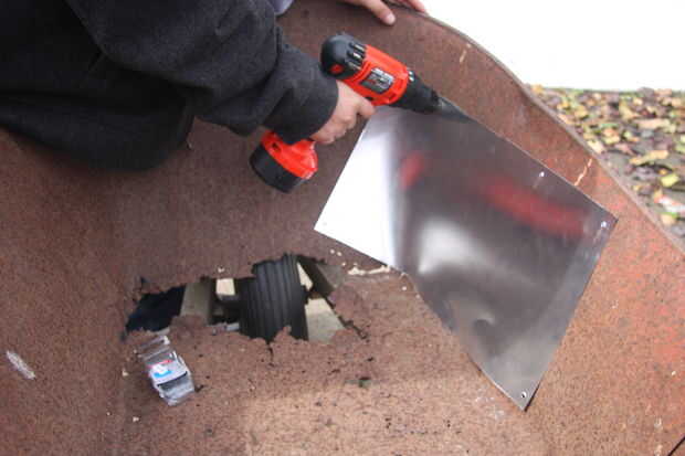 Chapa del lugar donde el daño está hecho. Utilizando un taladro eléctrico se haga agujeros en carretilla y con broca de 3/16 de chapa metálica.