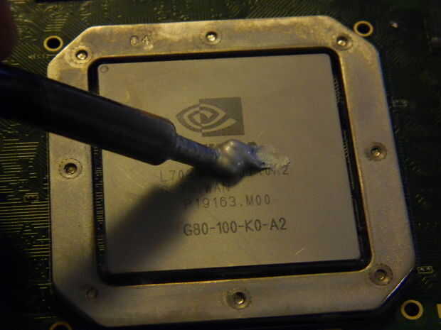 Para la cantidad de la pasta es fácil de aplicar. Puede hacer una capa delgada de la pasta por todo el chip o hacerlo como lo hago. Poner una pequeña bola de un tamaño de 3-5 mm de diámetro en el centro del chip y presione hacia abajo el disipador de calor a él. La pasta harán un gran círculo entre el chip y el disipador de calor y esparcirá uniformemente.