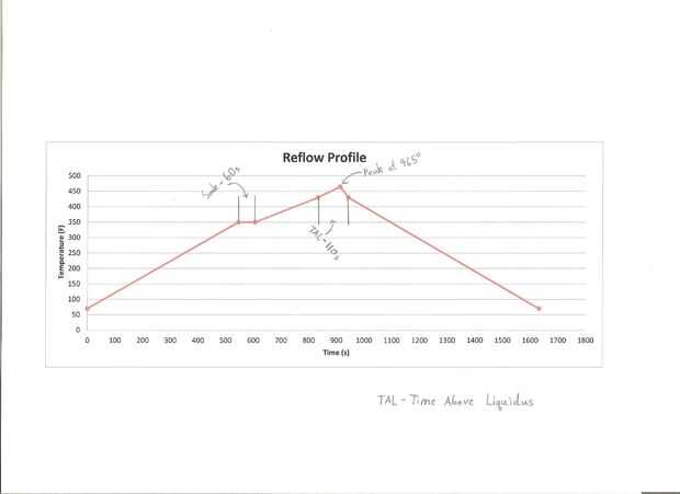 Así que aquí está una rápida carrera a través del perfil: la Junta va en el horno frío y se mantiene mientras el horno acerca a la temperatura de reflujo. Esto asegura que la Junta es la misma temperatura en todas partes (porque el horno se calienta lentamente, dando el calor suficiente tiempo para penetrar y disfrutar de todas las áreas). Como la temperatura de reflujo es alcanzada y superada, la soldadura se derrite. Una vez alcanzada la temperatura correcta por encima del punto de fusión de soldadura, se abre la puerta y un ventilador se utiliza para dibujar suavemente el aire caliente lejos de la cara del horno, que acorta el tiempo de que la soldadura es líquida por exceso de velocidad su enfriamiento.