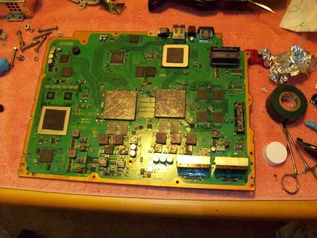 A continuación, poner todas las almohadillas térmicas tomaron de espalda en el tablero. No olvidar ninguna! Si lo hace, podría nuke un componente importante y matar a tu PS3.