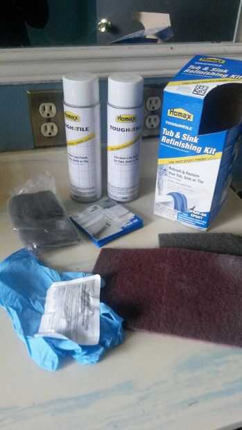 1. usted puede comprar una bañera y lavabo kit acabado en lowes por $45,00. Verifique que cubrirá su área. Puede ser que necesite más de un kit o pintura extra. Más profundidad direcciones pueden encontrarse en el kit.