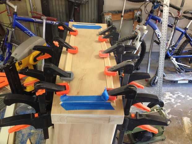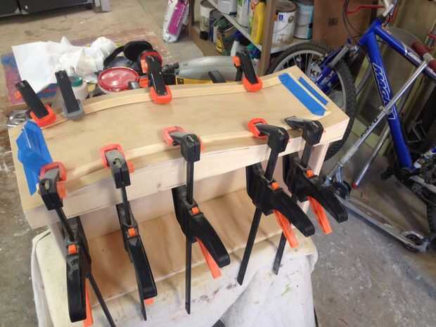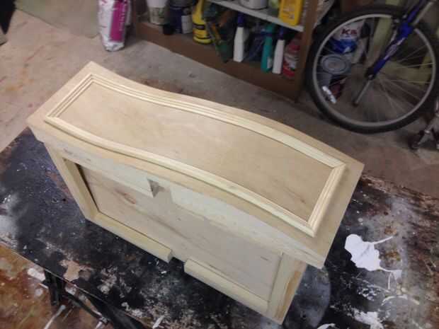 Nunca he añadido ajuste curva antes de esta manera. Corto ajuste de stock que se asemejan a la moldura en el cajón que había sobrado de un proyecto anterior. Los extremos estaban bien pero otra vez en tamaño las piezas largo ligeramente para adaptarse a la curva. He medido con una cinta de tela y añade aprox. 1/2" a la longitud. Después de haber leído en Instructables (voy a intentar encontrar el autor correctamente y agregar crédito completo!) Puse mis largos trozos de moldura en el fregadero de la fregona y dejarlos reposar al menos 30 minutos. Tomó uno por uno y había secado, añade pegamento y sujeta en su lugar. Repetí el paso con la otra pieza. Uso las piezas laterales como guías para la separación y mantiene en su lugar con cinta adhesiva.
