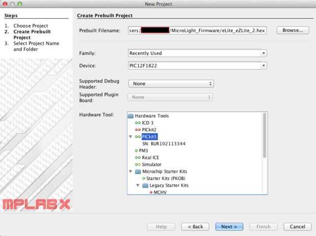 Para reprogramar el archivo hexadecimal que extrajo en el paso 17, cree un nuevo proyecto pero esta vez seleccione proyecto Prebuilt (Hex, Loadable de la imagen). Entonces busque archivo hexadecimal y crear el proyecto. Siga desde el paso 17.