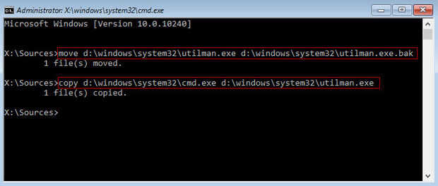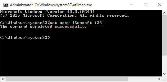 Paso 4: Al llegar a la pantalla de login de Windows 10, haga clic en el icono de "Accesibilidad" en la esquina inferior derecha. Esto hará que aparezca una ventana de utilman.exe. Desde la ventana, usted puede utilizar el comando: net usuario < nombre de usuario >< contraseña > restablecer contraseña de administrador local de Windows 10. Por ejemplo, en mi caso, tipo de usuario red iSumsoft 123 y presione la tecla Enter para restablecer la contraseña del usuario "iSumsoft" a "123", como se muestra en la segunda imagen al principio de este artículo.