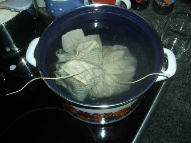 Ahora Asegúrese de que la resina forma un montón encima de la piedra y recoger las esquinas de la toalla para que sea una bolsa. Jale las esquinas juntos por encima de la piedra y - esto es difícil de describir y mucho más fáciles de hacer - mantenga por encima de la resina con los dedos envuelven la tela. Vas a atar este bolso con una cadena, así que asegúrese de que cuando lo haga, no habrá ningún orificio, digamos, de un pliegue que escapó de su alcance. Espero las fotos que tomé hará más clara.