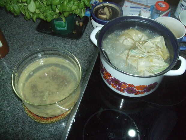 Dejarlo hervir un rato y más y más la resina se acumula en la superficie. El agua hirviendo debe reunir las cosas para usted - usted puede ver en la foto, las manchas amarillas "bailando sobre las olas".