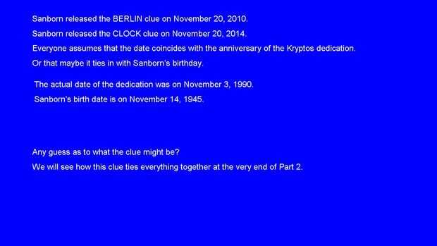 JS: Bueno, este es el mes que... UH... Kryptos dedicada hace 20 años. Fue dedicado el 5 de noviembre, hace 20 años. y... Ah... también es el mes de mi cumpleaños. Y... um... hay varias otras razones.