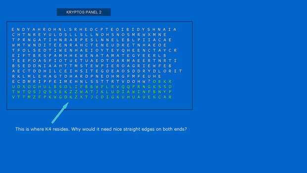 Cómo encontrar la puerta que se abre la llave de K4.Paso 1: K2 - el portal de KryptosTenemos que hacer algunas modificaciones al formato,Paso 2: K2 de la matriz OriginalPaso 3: K2 y K4Paso 4: Pattern MatchingParte 5 nos dio un raro buscando pista per