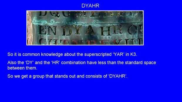Encontrar una pista que nos ayudará a analizar K4.Paso 1: K1 fraseKryptos fans deben estar familiarizados con éste.Paso 2: Analizar cada significadoPaso 3: Localizar la falta 'L' en 'IQLUSION'Paso 4: 'YAR' en K3Uno de los indicios visuales de Sanborn