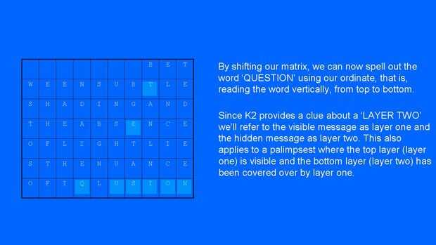 Cómo descubrir el mensaje de la capa dos en K3.Paso 1: Abscisa y palimpsesto son clavesHaga clic en cualquier diapositiva para ampliar,Paso 2: La matriz es CrucialPaso 3: Elonka ha hecho todo el trabajo por nosotrosPaso 4: Las clavesPaso 5: Utilice l