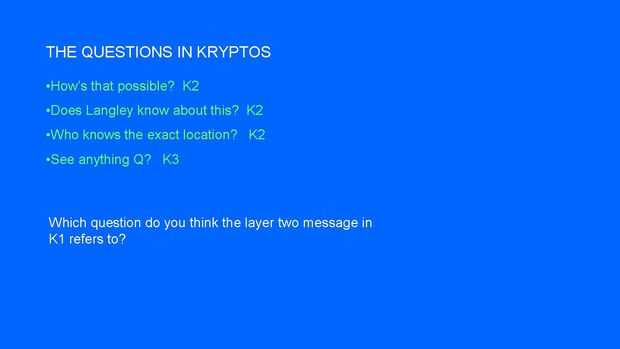 Encontrar una pista que nos ayudará a analizar K4.Paso 1: K1 fraseKryptos fans deben estar familiarizados con éste.Paso 2: Analizar cada significadoPaso 3: Localizar la falta 'L' en 'IQLUSION'Paso 4: 'YAR' en K3Uno de los indicios visuales de Sanborn