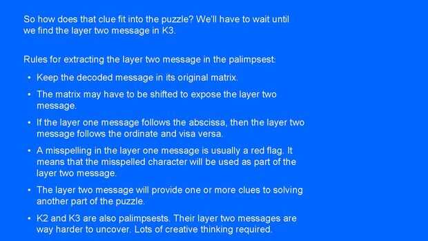 Cómo descubrir el mensaje de la capa dos en K3.Paso 1: Abscisa y palimpsesto son clavesHaga clic en cualquier diapositiva para ampliar,Paso 2: La matriz es CrucialPaso 3: Elonka ha hecho todo el trabajo por nosotrosPaso 4: Las clavesPaso 5: Utilice l