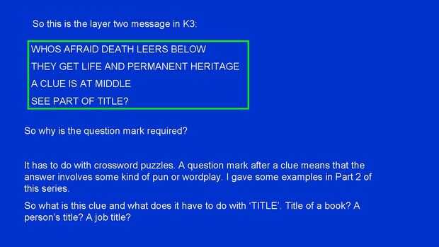 Originalmente, parte 8 iba a ser sobre el palimpsesto de K2. Pero el palimpsesto de K1 es mucho más fácil de usar como una demostración de las técnicas utilizadas.(Haga clic en cualquier diapositiva para agrandar)Paso 1: Las claves para descubrir el