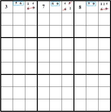 En el ejemplo anterior, 5, 6 y 9 monopolizar esos 3 espacios para que todos los demás en la misma fila tienen que quitar esos 3 números.