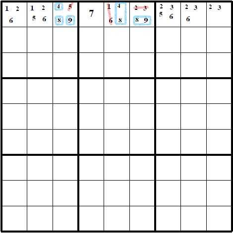En el ejemplo anterior el 4, 8 y 9 fueron exclusivos de las 3 células para que todos los otros números fueron quitados.