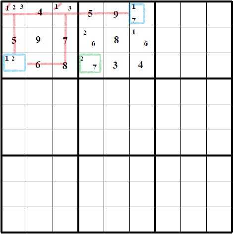 En el ejemplo anterior, hay un ala de XY de los números 1, 2 y 7, y puesto que los bloques exclusivos comparten un 1, haz borrado todos otros 1 en el mismo bloque que el 1 y 2 y en la misma fila que el 1 y 7.