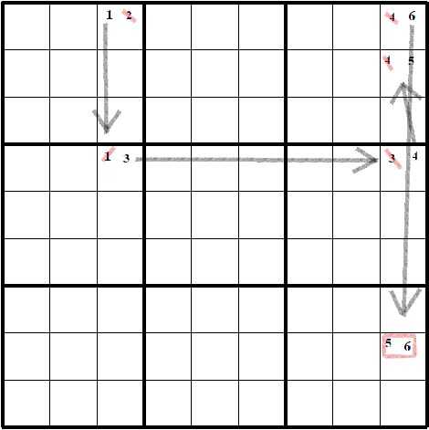 En el ejemplo anterior, me pongo en la celda 1 y 2 y la fuerza de las cadenas el 5 y 6 en la derecha del bloque inferior ambos hacia fuera creando una contradicción como esa célula sería ya no tienen posibilidades. Como resultado de encontrar una contradicción, podemos saber que la primera cadena no puede ser el número comenzamos con y tendría que ser el otro, posiblemente incluso obligando a otra cadena en su propio. Sin embargo, se subrayo otra vez que debe tenerse gran cuidado con este truco para evitar estropear el rompecabezas completo; todo lo que necesita es un error solo para hacer un sudoku imposible.
