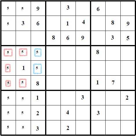 En el ejemplo, hay un par de espacios donde podría ser un 5 en la izquierda media cuadra en la tercera fila, marcada en azul, por lo que se pueden borrar todos los candidatos marcados en rojo