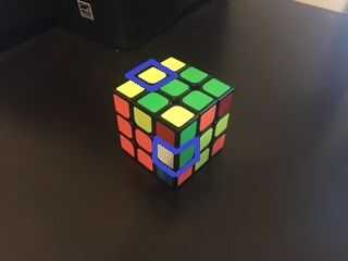 Identificar dos bordes incorrecta y colocarlos cada uno en una de las posiciones marcadas en la segunda imagen. Asegúrese de no romper el 3 x 2 colocando las aristas en las posiciones necesarias. Sólo necesita girar la parte superior y derecha capas para ponerlos en lugar.