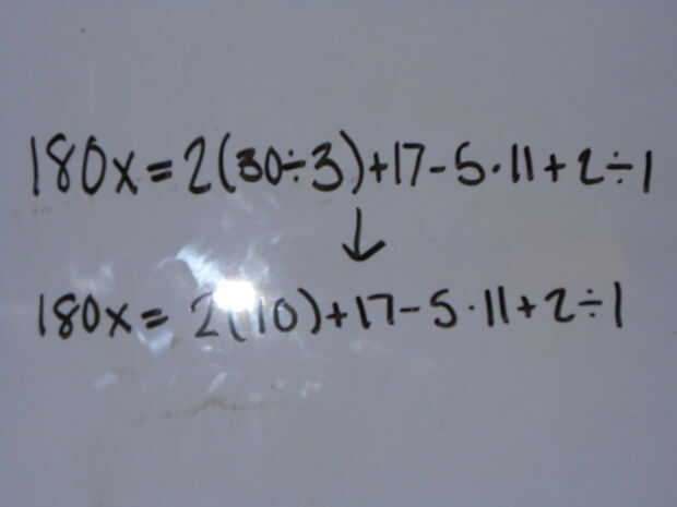Hay 2 formas de resolver el paréntesis: la propiedad de la distribución, o simplemente resolver la ecuación en paréntesis. Durante la distribución, se multiplica al número inmediatamente fuera del paréntesis por cada uno de los enteros en el interior. Cualquier método de obras, así que hacer lo que te gusta más. Me quedé con sólo resolver la ecuación en paréntesis: 30/3 = 10.