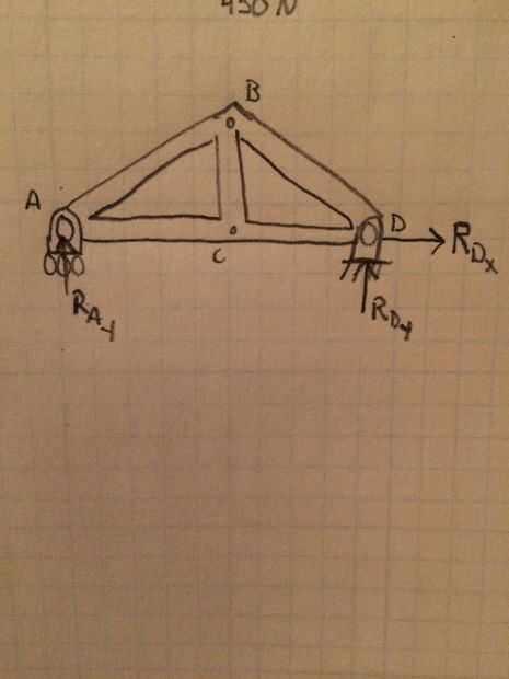 • El apoyo adecuado es un soporte de pin, que puede tener ambos una vertical y dirección de la fuerza y una fuerza de dirección x horizontal aplicado porque se planta firmemente al suelo. Estas fuerzas deben tener los nombres de las variables R_D_y y R_D_x.