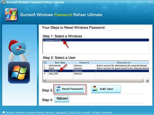 4. muestra el sistema operativo instalado en el ordenador y todas las cuentas de usuario existían en Windows. Seleccione el destino Windows y cuenta. Haga clic en el botón Restablecer contraseña.