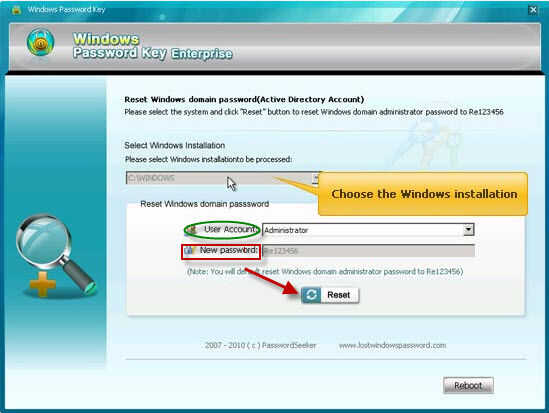 Paso 2: Uso de Windows Password Key Enterprise para restablecer contraseña de 2008