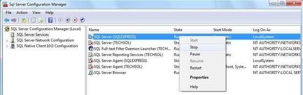 En el panel resultados, haga clic en la instancia de SQL Server y a continuación, haga clic en detener.