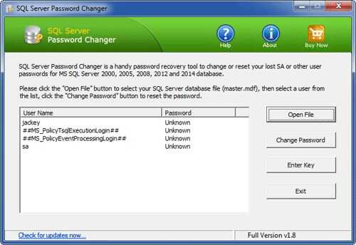 Una vez que hayas elegido el archivo master.mdf, el programa descifrarlo y a continuación, mostrar una lista de cuentas de usuario de base de datos. Seleccione su cuenta de SA y haga clic en el botón "Cambiar contraseña". Establecer una nueva contraseña y haga clic en Aceptar.