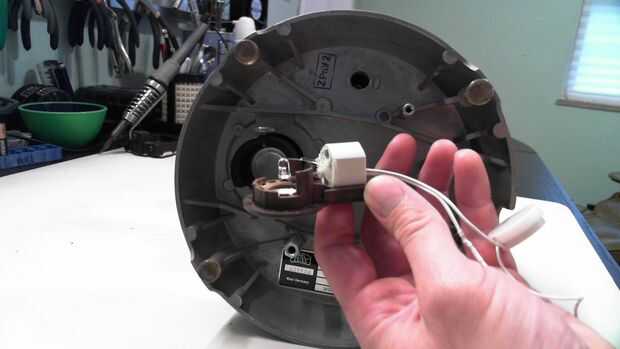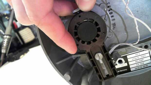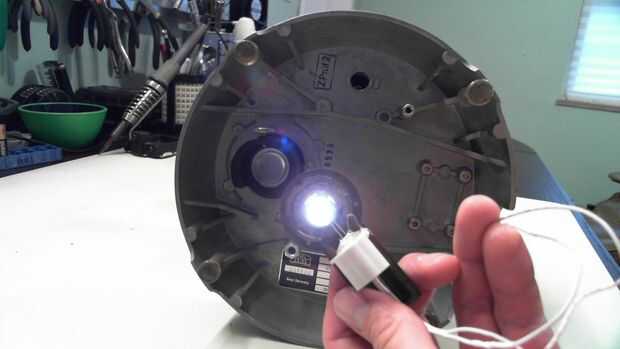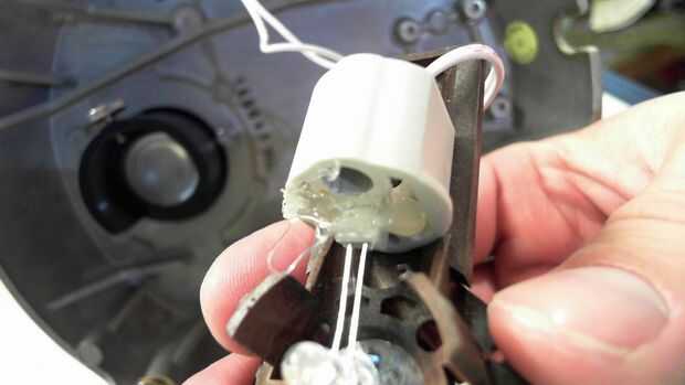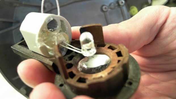 Había doblado los cables de LED a 90 grados para que el LED apuntaría directamente hacia arriba a través hacia el soporte de diapositivas y en el objetivo. Como se puede ver he dejado el resto de la vivienda intacta ya que contiene un reflector detrás de lo LED y encajaría muy bien en el foco de luz spot sin otras modificaciones.