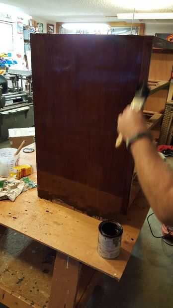 Limpiar la madera y liberarla de toda la Sierra de polvo y suciedad. Tome un cepillo viejo y aplique el colorante (hemos utilizado una mancha de roble de la misión porque queríamos algo fiel al tipo de madera y oscuro para que contraste el hardware). Cepille en la dirección de la veta y tratar de evitar burbujas de aire y secado en la superficie de la madera. Entonces siéntese y deje que se seque. Dejado durante la noche y volvió a él por la mañana!