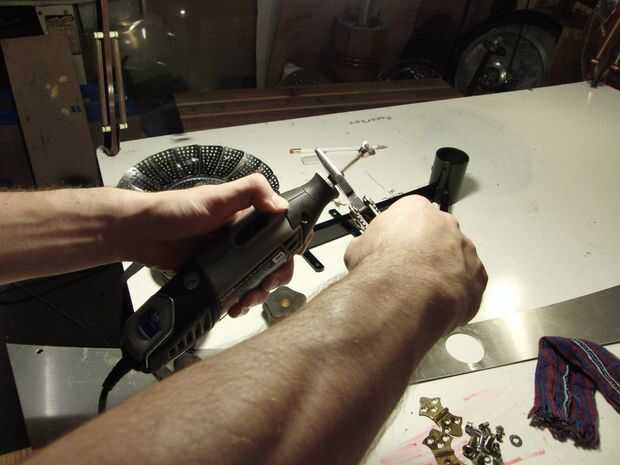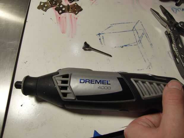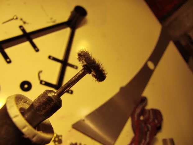 Vez que haya quitado como mucho a la corrosión como se podría llegar con el cepillo de la taza, cambiar a la 428 rueda de cepillo duro y los detalles para llegar a lugares. Afl ojar el mandril en la Dremel y coloque el nuevo cepillo, asegurándose de que usted tiene suficiente del eje que sobresale para llegar a la superficie, pero asegurarse de que tiene al menos 3/8"(~ 10mm) en el mandril por lo que su cepillo no decide separarse de la Dremel y spinning. Encontré que este cepillo hizo bien en alrededor de 20.000 RPM, y esa energía rotacional es nada para tomar a la ligera. También usé este cepillo para pulir sus pies, que son las bisagras de latón plateado. Era cuidadoso y nos fue bastante bien, pero generalmente para limpiar delicadamente plateado o de metal suave, esto es donde utilizas la rueda de cepillo de Nylon 403.