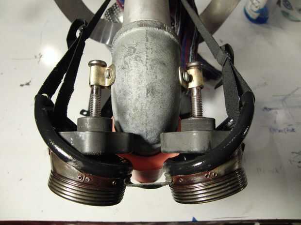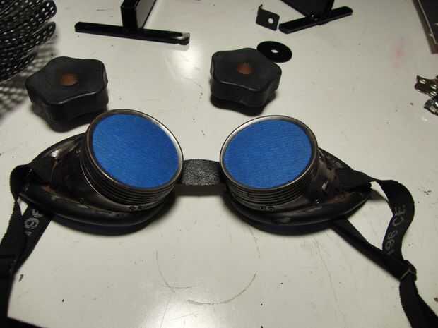 Puedes ver el final del cepillo de alambre pulido en las gafas, la corrosión era tan pesada que partes de la superficie se decoloran permanentemente. Importaba esto y fue con una buena capa de sellador acrílico en gafas de aviador de Emma después de grabar el vidrio y había cubierto su cola (la cesta de la vaporera metal), así. Usé el spray de epoxy del aparato sobre sus base/patas, los pernos que sujetan sus ojos en su lugar y un pequeño soporte en L y una arandela. El interior de sus ojos tiene una nueva capa de oro. Su cuello es de aluminio y la cabeza es de acero galvanizado, por lo que no estaba particularmente preocupado con las partes