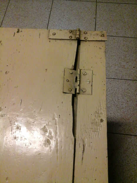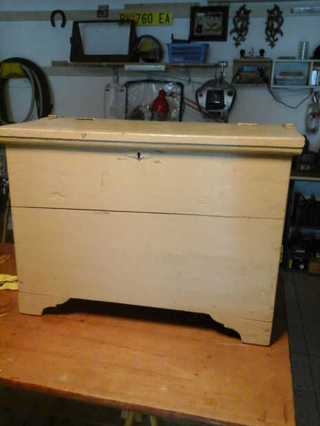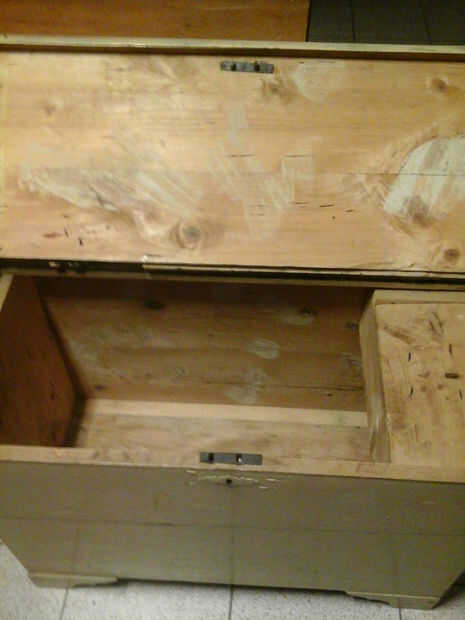 En noviembre pasado encontré este viejo pecho, la forma era agradable pero trataron muy mal; las bisagras originales estaban rotas y también la madera. Bisagras adicionales fueron atornilladas de alguna manera y una gran grieta estaba presente en el frente.