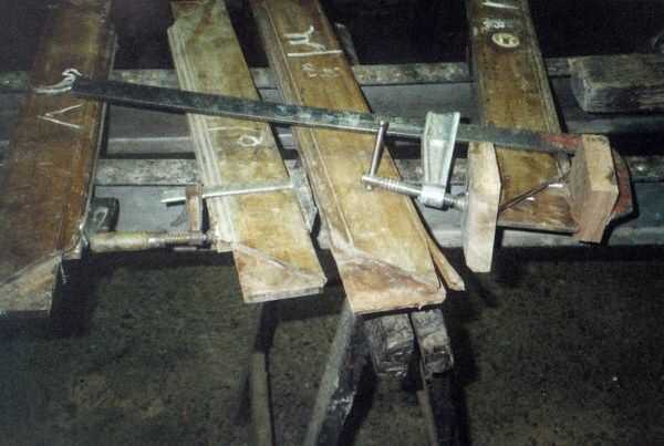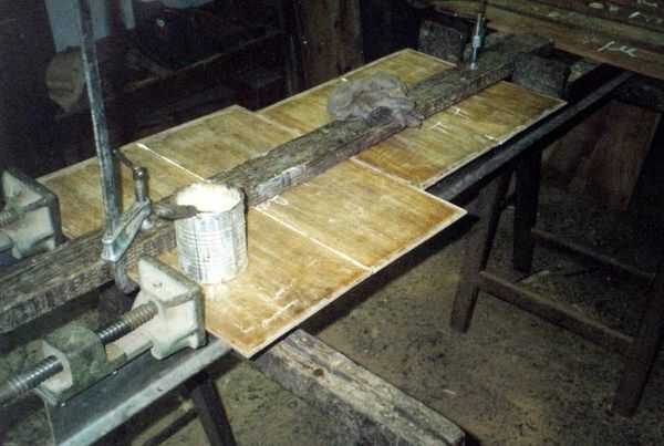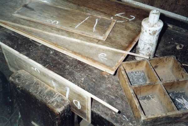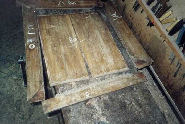 Los paneles varios también han sido desmontados et algunos de los fragmentos será pegado detrás. La madera tiene una tendencia a rectract. Para dar sus dimensiones originales nuevo que vamos a utilizar realmente delgadas barras del mismo color para completar los paneles. Esto tiene que hacerse en cada panel.