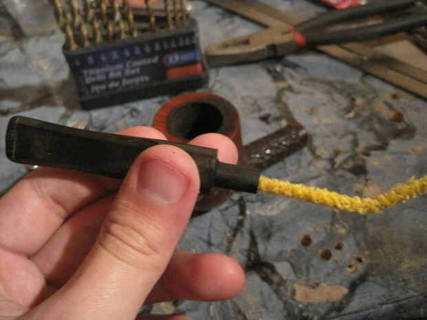 Siempre empiezo con un limpiador de pipa con un poco de alcohol en él para limpiar hacia fuera el vástago y el agujero del proyecto en la tubería. Tuve la suerte con este que no ha fumado mucho (o sólo muy limpias) y vajillas muy poco para que queden limpios.