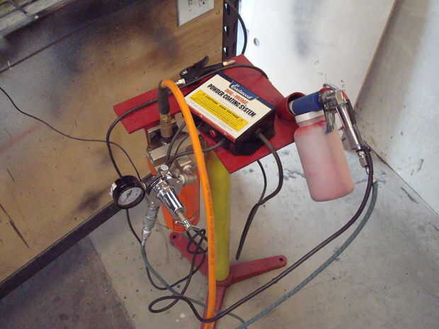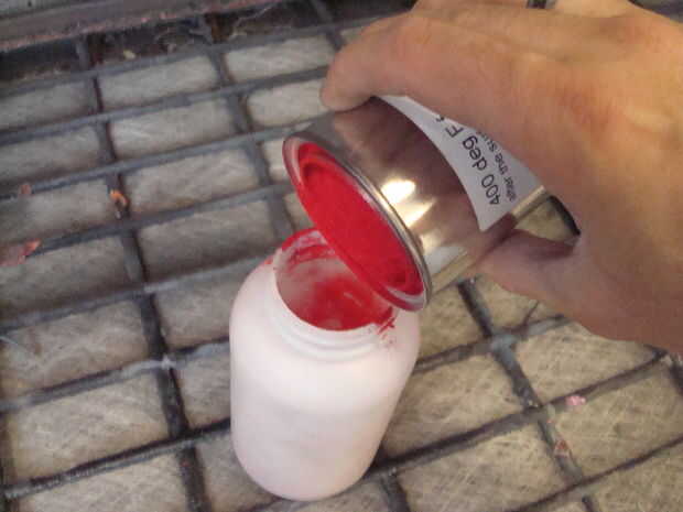 Mientras la masa gancho/pala se secan en el horno un TI todavía se está levantando a temperatura permite configurar el arma de la capa de polvo.  Primero conecte la manguera al regulador.  Luego conecte la manguera de aire de la pistola de recubrimiento de polvo al otro extremo del regulador y marcar hasta 5 PSI(10.93 Gram force/square centimeter) una vez que está todo listo descargó el polvo en la tolva (el tarro buscando cosita) y atornillado lo nuevo en la pistola.  Ahora era tiempo para agarrar la masa gancho/pala del horno y colgar en la cabina de la pintura.  No olvide sus guantes al hacerlo los chicos están calientes.