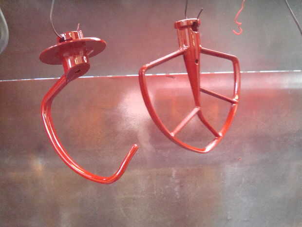 Bien mi contador fue así que agarré la masa gancho/pala colgado en la cabina de pintura al fresco y lleno los guantes lejos.  Una vez se había enfriado y aún estaba desconcertado por qué diablos el chico fue corte en el acero con el cortador de agua.  Maletas mi masa gancho/pala en mi bolso y cabeza donde instalarlos.  Creo resultaron de gran y después de ver algunos de los impresionantes colores puedes elegir que esto podría ser una gran manera de personalizar tu KitchenAid.  Creo que el rojo se ve muy bien con mi batidora de metal de arma que ahora es verdaderamente uno de una clase.