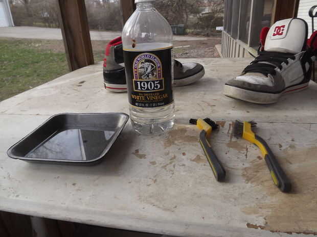 se trata de sólo mi intento improvisado de haciendo un instructible este es mi primer. materiales que necesitarás: zapatos y cepillos de bandeja pequeña de vinagre.
