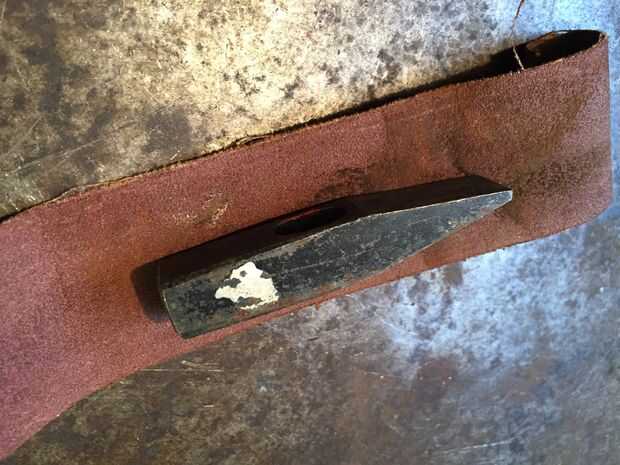 Después de haber tomado hacia fuera de la manija, empiezas a lijar la cabeza de martillo para sacar cualquier óxido o suciedad que está allí.