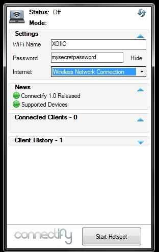habrá un icono pequeño en la mano derecha de la barra de tareas, haga clic en él y se va a abrir los controles de Connectify. Introduzca su nombre de red, contraseña y qué conexión a internet que desea compartir.