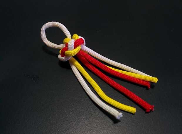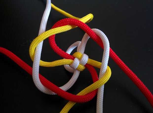 Primero crear un nudo cruzado, introducir la tercera cuerda, luego crear un nudo de corona y finalmente crear un nudo de diamante de 6 hebras.