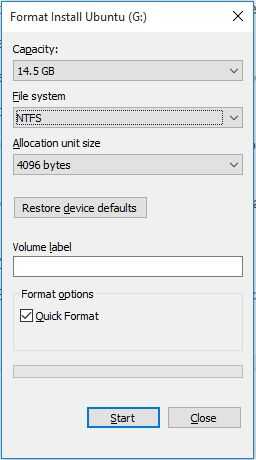Seleccione NTFS en el campo de sistema de archivos.