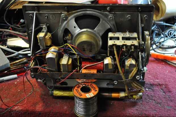 en la foto puedes ver la parte posterior del chasis, la radio está al revés. en el centro está el altavoz. justo debajo de él hay dos cilindros cubiertos de cartón, los condensadores. Estos radios de lonchera tamaño de transistor temprano utilizan piezas similares a sus precursores del tubo de vacío.