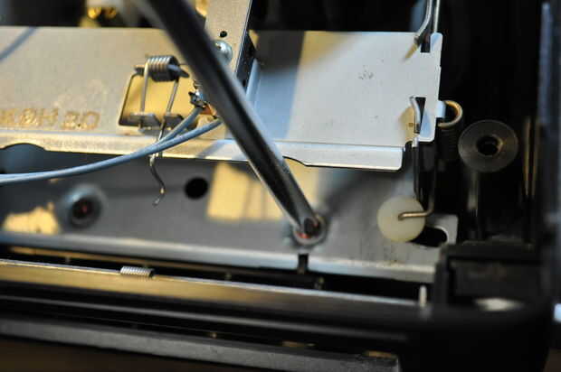 el mecanismo de la cinta de estos portátiles se atornillarán normalmente hasta la caja de plástico con unos tornillos (Foto 1). Esta máquina tiene 4 tornillos a quitar para liberar su mecanismo. una vez que los tornillos están fuera, cuidadosamente levante el mecanismo hacia fuera y póngala con el lado de la correa hacia arriba (Foto 2). que tendrás que quitar algunos lazos de alambre para conseguir suficiente juego en los cables para mover cosas.